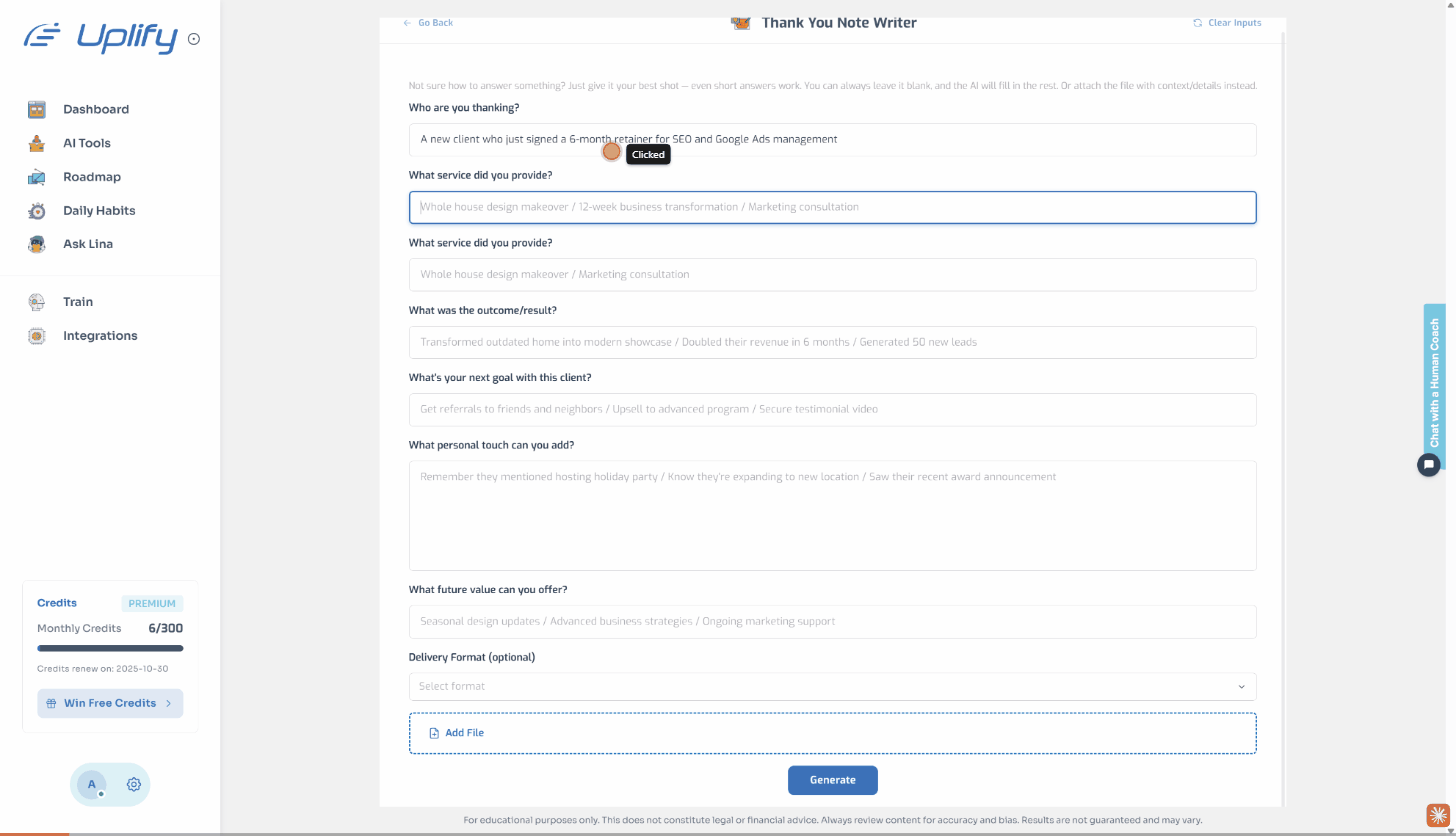 Coaches use AI Thank You Note Generator for client milestones. Your thank you note celebrates coaching breakthroughs and wins. Then satisfied clients become your best referral source.