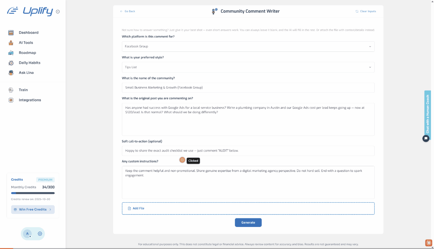 Our AI community comment writer crafts thoughtful, value-packed replies instantly. Build your presence in online communities, attract ideal clients, and grow your authority without spending hours writing.